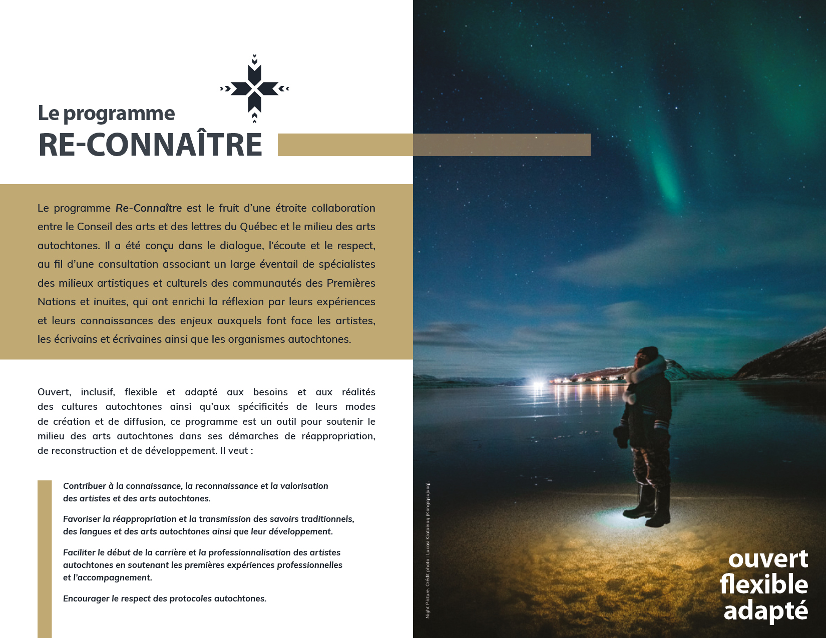 Ouvert, inclusif, flexible et adapté aux besoins et aux réalités des cultures autochtones ainsi qu’aux spécificités de leurs modes de création et de diffusion, ce programme est un outil pour soutenir le milieu des arts autochtones dans ses démarches de réappropriation, de reconstruction et de développement.