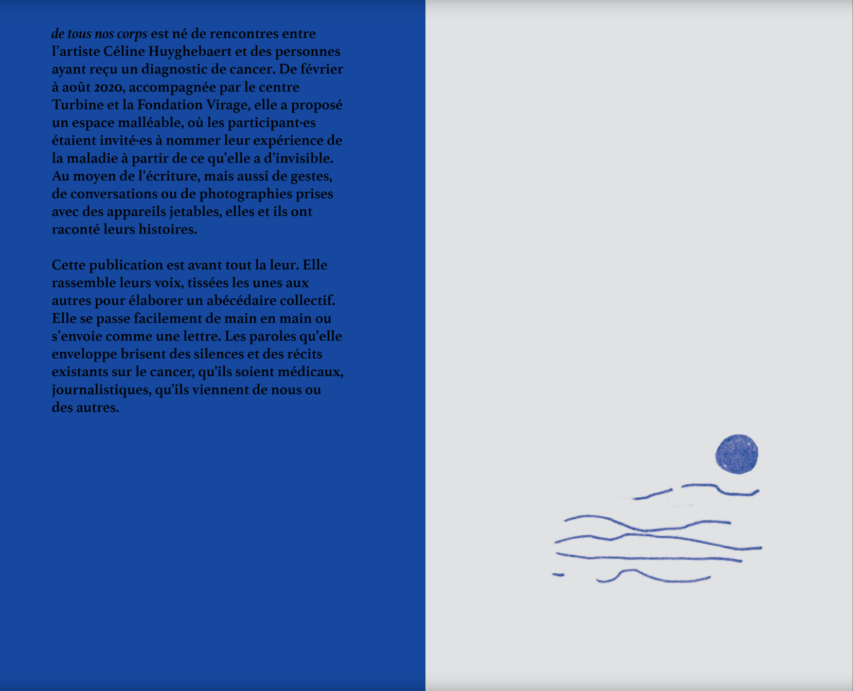 Avec de tous nos corpsCe lien s'ouvrira dans une nouvelle fenêtre, l’artiste Céline Huyghebaert a développé un projet de cocréation sur deux ans autour des tabous et des expériences invisibles du corps malade en allant à la rencontre de personnes ayant reçu un diagnostic de cancer. Accompagnée par le centre Turbine et par la Fondation Virage (CHUM), elle a proposé un espace de discussion et de création malléable où les participantes et les participants ont pu nommer leurs expériences de manière artistique et faire entendre leurs voix. Ces rencontres ont donné naissance à la publication de tous nos corps, imprimée en 500 exemplaires en risographie, et distribuée gratuitement dans les réseaux de la santé et auprès du grand public.