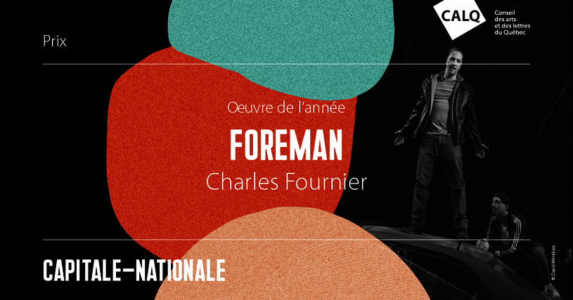 Le Conseil des arts et des lettres du Québec est heureux de décerner le Prix du CALQ – Œuvre de l’année dans la Capitale-Nationale à Charles Fournier pour sa pièce de théâtre FOREMAN. Ce prix, assorti d’un montant de 10 000 $, lui a été remis par André Racette, directeur du soutien à la diffusion et au rayonnement international du Conseil des arts et des lettres du Québec, lors de la cérémonie des Prix d’excellence des arts et de la culture tenue aujourd’hui au Diamant. Cet événement annuel vise à honorer les artistes professionnel(le)s, les organismes et les entreprises qui, par leur engagement, leur créativité ou leur innovation, contribuent à l’essor culturel des régions de la Capitale-Nationale et de Chaudière-Appalaches.