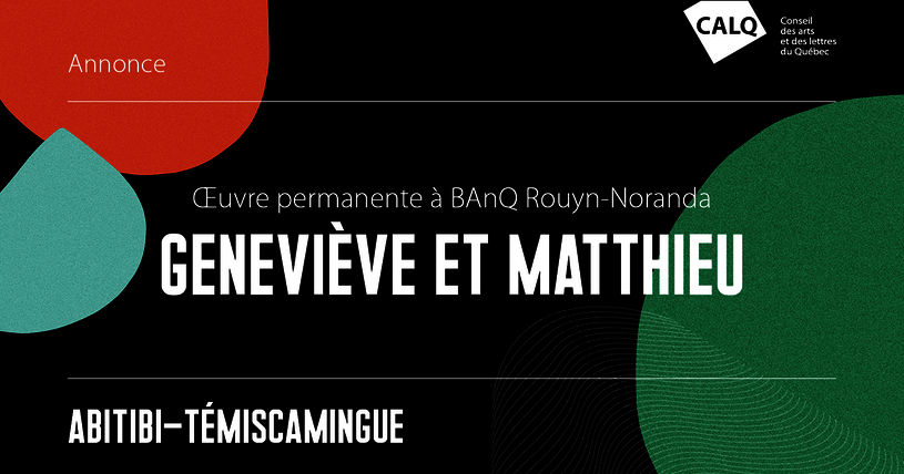 En septembre prochain, Bibliothèque et Archives nationales du Québec (BAnQ) accueillera une nouvelle œuvre originale réalisée par les artistes Geneviève Crépeau et Matthieu Dumont, afin d’enrichir l’aire publique des Archives nationales du Québec à Rouyn-Noranda. Le soutien financier du Conseil des arts et des lettres du Québec, de BAnQ et de la Fondation de BAnQ permettra la réalisation de cette œuvre originale permanente qui soulignera la richesse des fonds d’archives que BAnQ conserve.