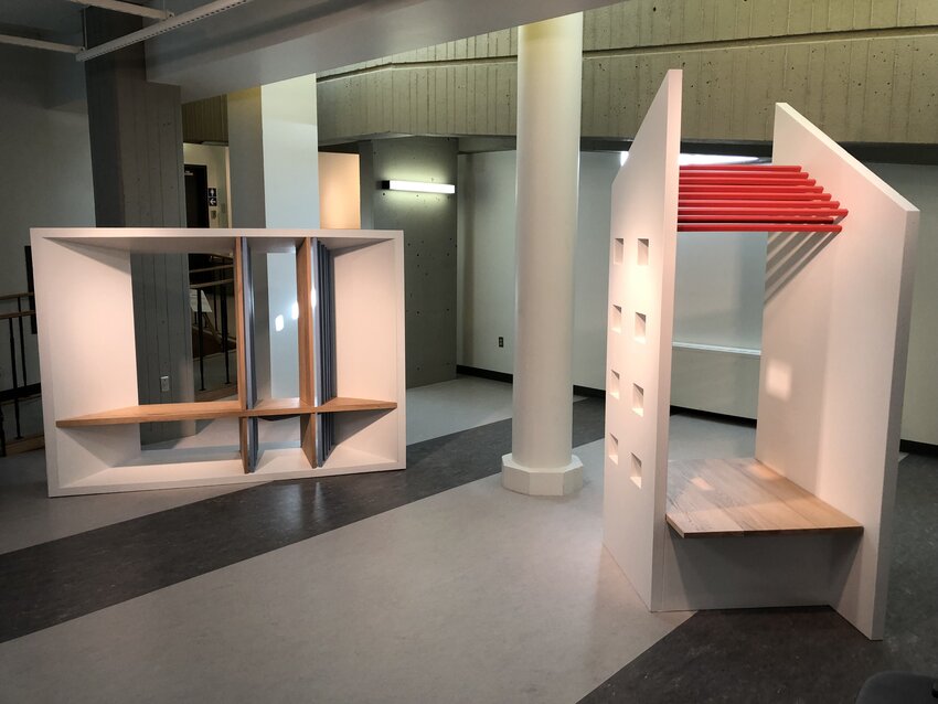 L’installation conçue par Olivier Vallerand et Louis Routhier, constituée de deux structures, s’inspire du travail modulaire moderniste qui a caractérisé les travaux de la firme d’architecture Gauthier, Guité et Roy de Québec. Les recherches effectuées par les artistes dans le volumineux fonds d’archives de cette firme, conservé à BAnQ Québec, les ont dirigés vers les dessins d’architecture illustrant deux bâtiments :