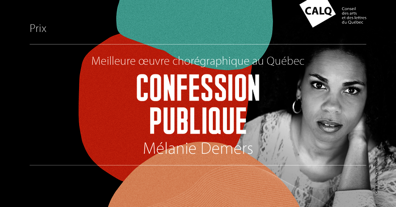 Le Conseil des arts et des lettres du Québec est heureux de remettre le prix du CALQ pour la meilleure œuvre chorégraphique au Québec à Mélanie Demers pour son spectacle Confession publique. Ce prix, assorti d’un montant de 10 000 $, lui a été remis par Anne-Marie Jean, présidente-directrice générale du Conseil des arts et des lettres du Québec, lors de la cérémonie des PRIX DE LA DANSE DE MONTRÉAL, aux studios de la Compagnie Marie Chouinard, à Montréal.