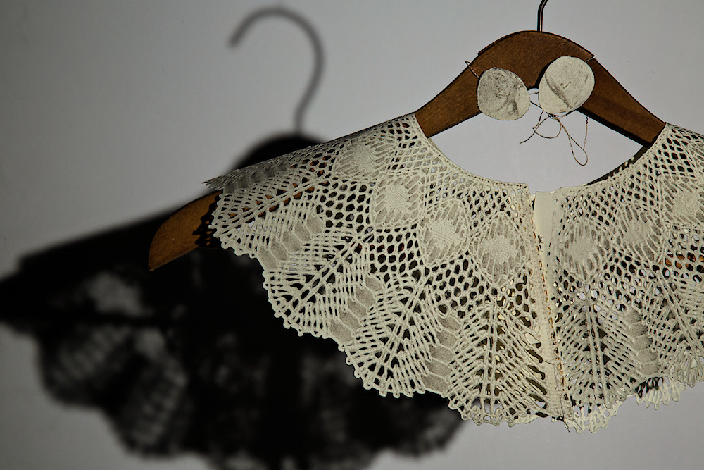 L’installation Dentalium est composée d’un collet à motifs de dentelle imprimé en lithographie suspendu à un cintre en bois, ainsi que d’un dyptique où l’on peut voir des dessins de châles et de mains imprimés en lithographie desquelles descendent deux mèches de cheveux. Abordant l’identité comme sujet central, cette œuvre porte un regard sur les changements culturaux qu’a engendrés l’industrialisation de notre société occidentale.