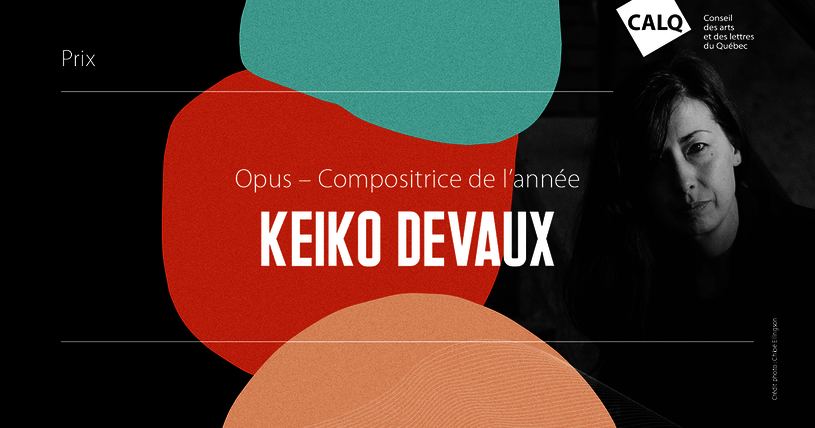 Le Conseil des arts et des lettres du Québec (CALQ) est heureux de s’associer au Conseil québécois de la musique (CQM) en remettant un montant de 10 000 $ à Keiko Devaux, lauréate du prix Opus de la Compositrice de l’année. Cette récompense lui a été décernée lors du gala des prix Opus présenté aujourd’hui de manière virtuelle sur la page Facebook de La Fabrique culturelle de Télé-Québec Ce lien s'ouvrira dans une nouvelle fenêtre.