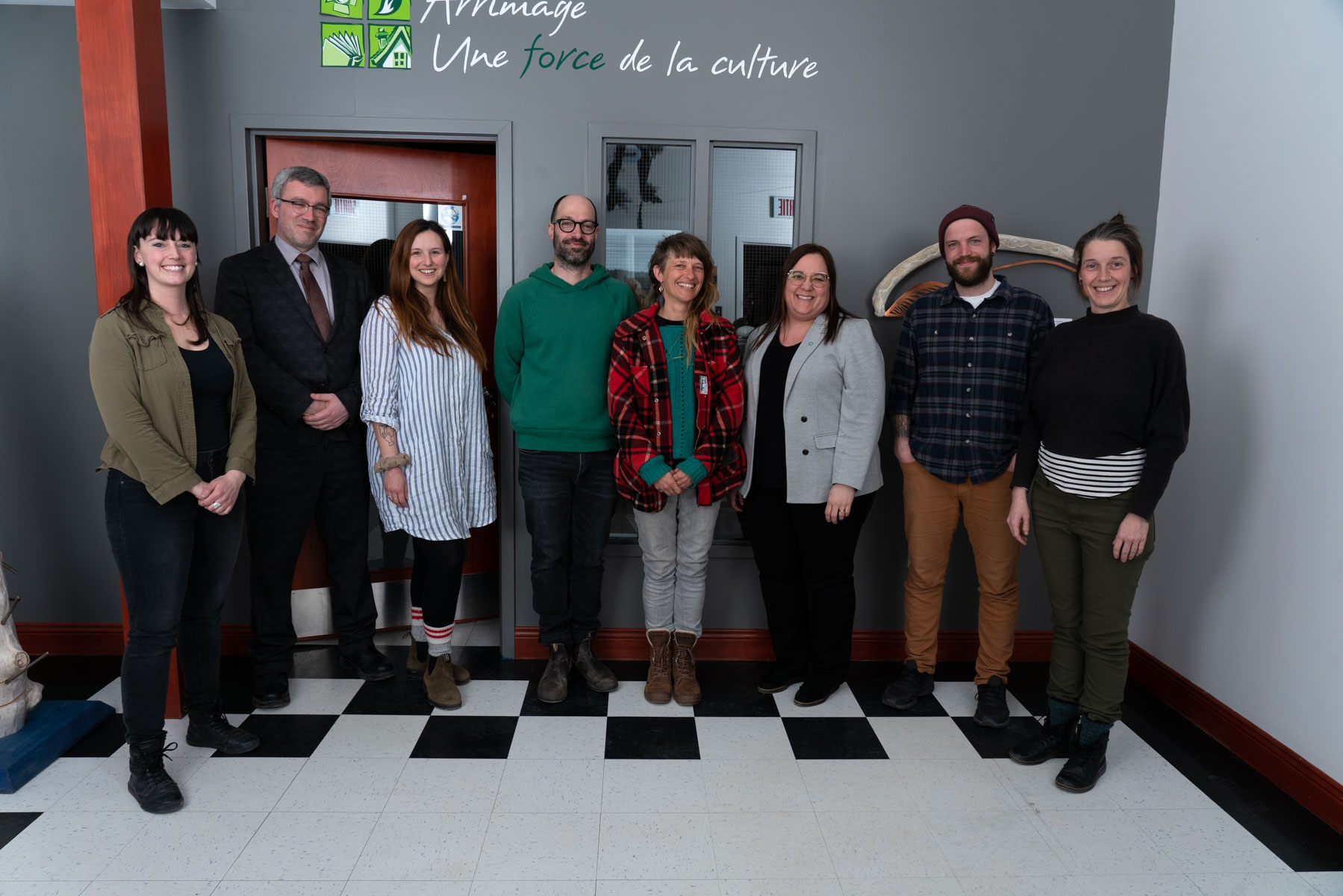 Sur la photo (de gauche à droite) : Cindy Mae Arsenault (artiste), Antonin Valiquette (président de la Communauté maritime des Îles-de-la-Madeleine), Marie Ève Laure (Au Vieux Treuil), Émile Déraspe (Au Vieux Treuil), Laurène Janowsky (AdMare centre d’artistes en art actuel), Cindy Gagné (directrice du développement des marchés pour les Caisses Desjardins des Îles), Gilbert Richard (artiste) et Véronique Leblanc (AdMare centre d’artistes en art actuel).