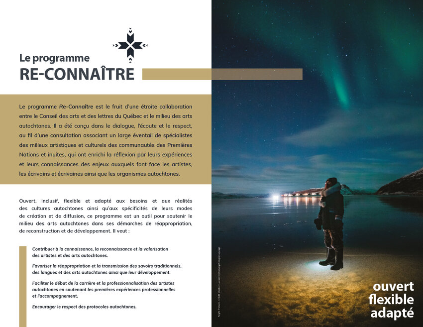 Le programme Re-Connaître est le fruit d’une étroite collaboration entre le Conseil des arts et des lettres du Québec (CALQ) et le milieu des arts autochtones. Il a été conçu dans le dialogue, l’écoute et le respect, au fil d’une consultation associant un large éventail de praticiens des milieux artistiques et culturels des communautés des Premières Nations et InuitesCe lien s'ouvrira dans une nouvelle fenêtre, qui ont enrichi la réflexion par leurs expériences et leurs connaissances des enjeux auxquels font face les artistes, les écrivains et les organismes autochtones.