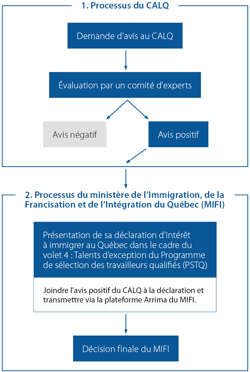 Dans le cadre du volet 4 : Talents d’exception du Programme de sélection des travailleurs qualifiés (PSTQ), le ministère de l’Immigration, de la Francisation et de l’Intégration du Québec (MIFI) confie au Conseil des arts et des lettres du Québec (CALQ) le mandat d’évaluer les demandes d’avis de talents d’exception dans le domaine des arts.