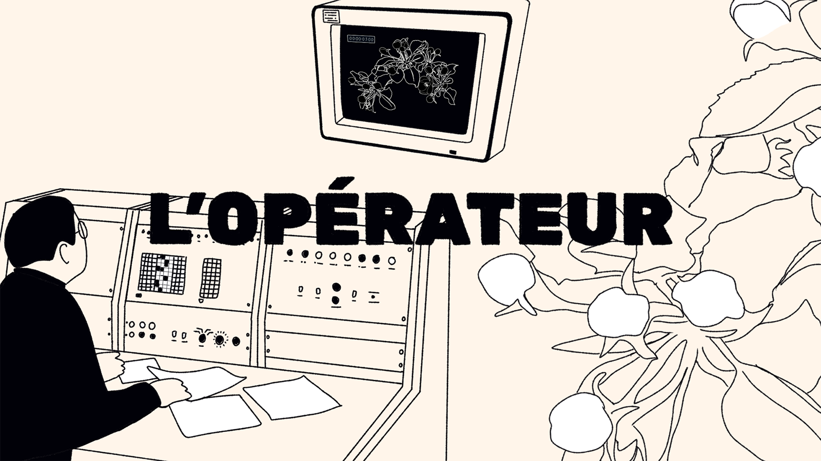 L’opérateur est une animation recourant aux techniques de dessin traditionnel à la main et de design à l’ordinateur. À travers un fouillis informatique dense, l’opérateur chargé de gérer le matériel visuel de la mosaïque d’écrans subit une perte de contrôle visuel. L’installation est inspirée des grandes consoles techniques issues des années 1950-1960, notamment celle de la conquête spatiale ainsi que celles des opératrices téléphoniques de cette époque.