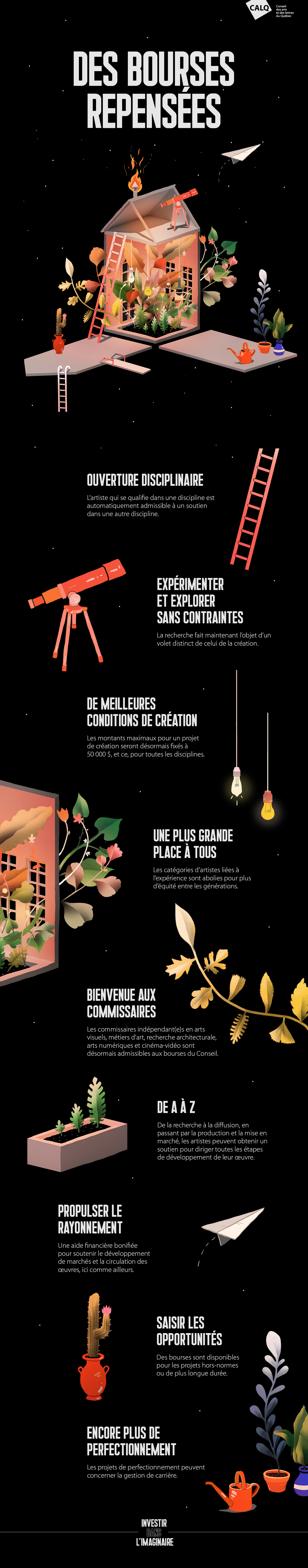 Le Conseil exprimait ainsi sa volonté de contribuer à l’amélioration des conditions socioéconomiques de ses boursier(-ière)s, un des objectifs au cœur de la Politique culturelle du Québec Partout la cultureThis link will open in a new window. Cette volonté rejoignait également les orientations stratégiques This link will open in a new window du Conseil. Le déplafonnement représente ainsi une reconnaissance souhaitable et concrète du travail des artistes et des écrivain(e)s, leur permettant d’obtenir un meilleur revenu pour se consacrer à leur art pendant la durée de leur projet.