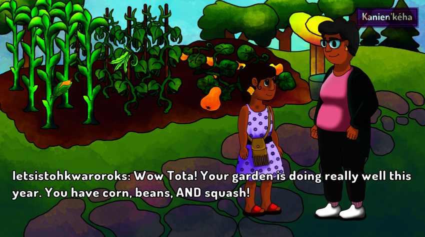 For example, her most recent project, KARIHONNIENNIHTSHERAThis link will open in a new window, an interactive bilingual story in Kanien’kéha and English, features a young girl whose grandmother teaches her the importance of protecting the planet. The piece makes it possible to develop a vocabulary for the local fauna and flora on Mohawk territory and offers vibrant, finely drawn images. The first game entirely written, drawn, and designed by Kahentawaks (aside from the coding), KARIHONNIENNIHTSHERA had an enthusiastic reception at the 2019 edition of the imagineNATIVE Film + Media Arts Festival This link will open in a new window, the world’s largest event for Indigenous film and media art.